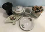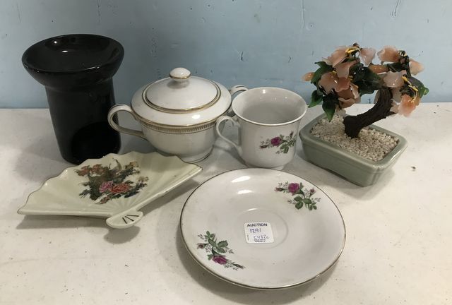 Porcelain covered dish, tea cup and saucer, Faux Jade tree, hand painted fan dish, candle holder. Porcelain covered dish, tea cup and saucer, Faux Jade tree, hand painted fan dish, candle holder.