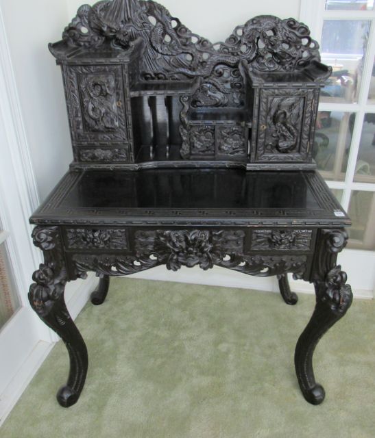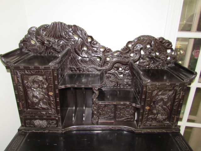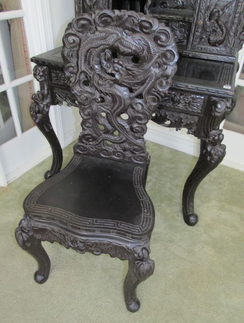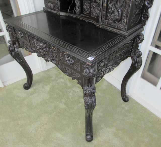 240 Japanese Carved Ebonized Wood Writing Desk with Chair