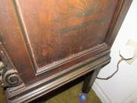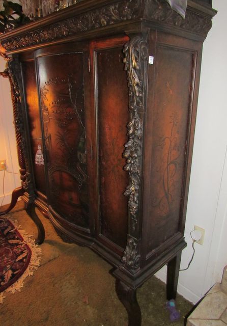 Asian scene design on front door, side panels have floral stencil, there is wear, has chips on finish, and glass shelves, 68"h., 54"w. Asian scene design on front door, side panels have floral stencil, there is wear, has chips on finish, and glass shelves, 68"h., 54"w.