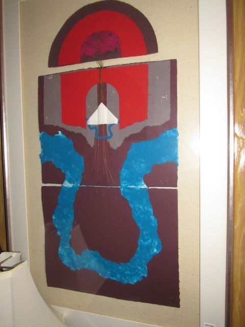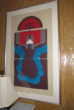 Dolph Smith is form Memphis, TN, know for unique methods of painting and designing art pieces. This one features three seperate paper sections, painted, stencil and string designs, signed, not dated. 40"h., 25"w. Dolph Smith is form Memphis, TN, know for unique methods of painting and designing art pieces. This one features three seperate paper sections, painted, stencil and string designs, signed, not dated. 40"h., 25"w.
