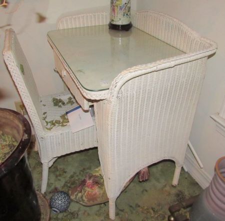 White wicker with glass top insert, 33"h., 34"w. White wicker with glass top insert, 33"h., 34"w.