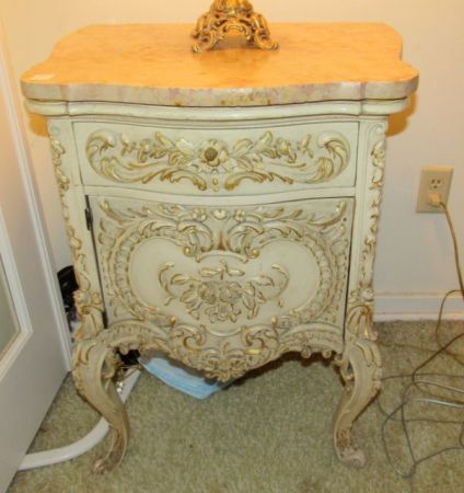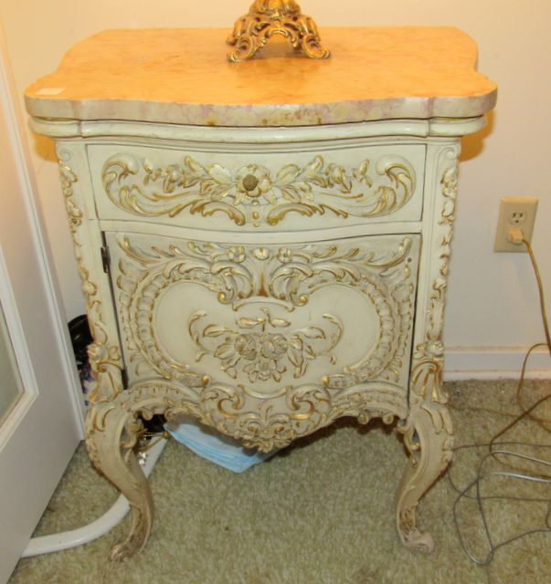 Painted with gold accents, has a added marble top, vintage, 29"h., 21"w. Painted with gold accents, has a added marble top, vintage, 29"h., 21"w.