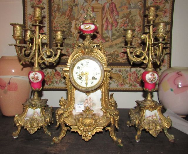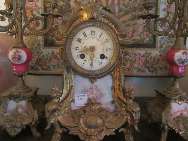 French style 3 piece set with exquisitely decorated portrait handpainted porcelain. One candelabra has damaged porcelain, 15"h. French style 3 piece set with exquisitely decorated portrait handpainted porcelain. One candelabra has damaged porcelain, 15"h.