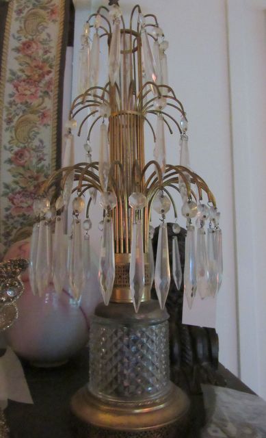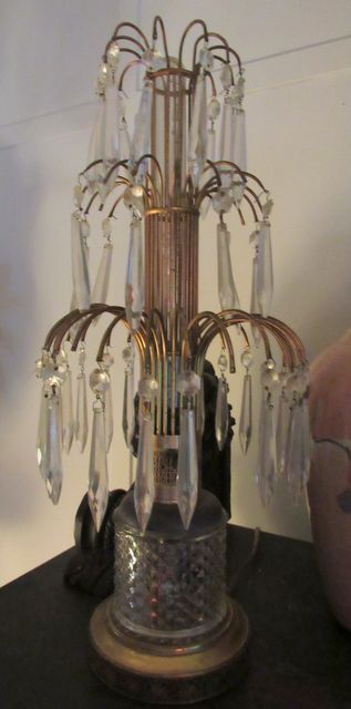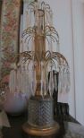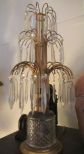 Brass frame, pressed glass base, three tier waterfall crystals, 19"h. Brass frame, pressed glass base, three tier waterfall crystals, 19"h.