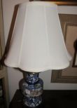 Blue and white, hand painted scene, wood base, 27"h. Blue and white, hand painted scene, wood base, 27"h.