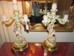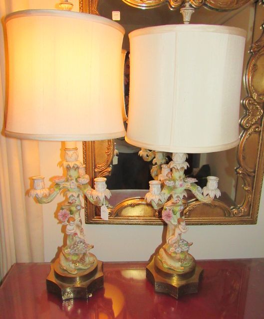 Porcelain, cherub figures, brass bases, 32"h. Porcelain, cherub figures, brass bases, 32"h.