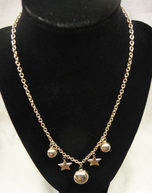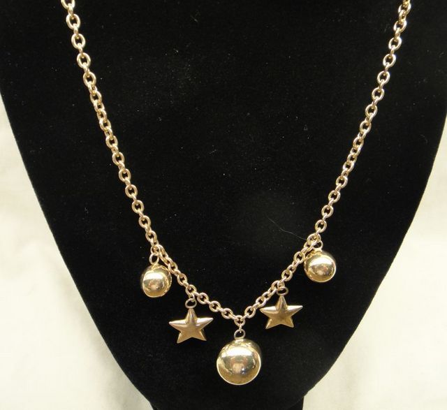 One stamped 14KT yellow gold lady's star and moon necklace on an 2.2mm thick, 18" long link chain with a bright polish finish. Total Weight of 2.2mm Thick, 18" Long Link Chain 7.00 dwt One stamped 14KT yellow gold lady's star and moon necklace on an 2.2mm thick, 18" long link chain with a bright polish finish. Total Weight of 2.2mm Thick, 18" Long Link Chain 7.00 dwt