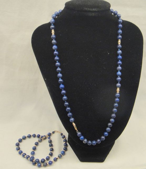 114 One stamped 14KT yellow gold lady's lapis beaded necklace and two bracelet set