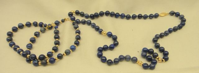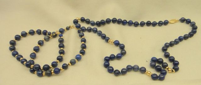 One stamped 14KT yellow gold lady's lapis beaded necklace and two bracelet set with a bright polish finish. Necklace- 18" Bracelets- 7" Containing: One hundred two bead standard cut natural lapis lazulis, measuring 6.00 x 6.00 x 6.00mm, approximate total weight of 174.00ct., clarity is eye clean, medium, moderately strong, blue color, (GIA B 5/4), cut is fair. Total Weight of Colored Stones 174.00ct. One stamped 14KT yellow gold lady's lapis beaded necklace and two bracelet set with a bright polish finish. Necklace- 18" Bracelets- 7" Containing: One hundred two bead standard cut natural lapis lazulis, measuring 6.00 x 6.00 x 6.00mm, approximate total weight of 174.00ct., clarity is eye clean, medium, moderately strong, blue color, (GIA B 5/4), cut is fair. Total Weight of Colored Stones 174.00ct.