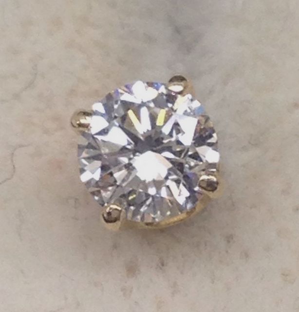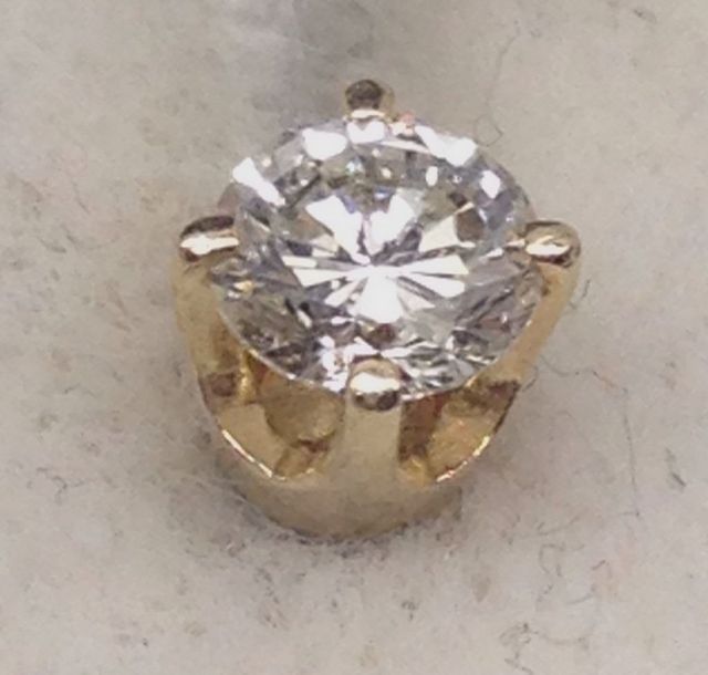 One pair stamped 14KT yellow gold lady's die struck diamond stud earrings with friction post with nut backs with a bright polish finish. Containing: Two prong set round brilliant cut diamonds, measuring 4.07-4.02 x 2.43mm (depth est.) approximate total weight of 2 Stones= 0.49ct. Clarity- SI-2 to I-1; Color- J-L; Cut- Good. Total Weight of Diamonds 0.49ct. Total Weight of Stud Earrings 0.50 dwt One pair stamped 14KT yellow gold lady's die struck diamond stud earrings with friction post with nut backs with a bright polish finish. Containing: Two prong set round brilliant cut diamonds, measuring 4.07-4.02 x 2.43mm (depth est.) approximate total weight of 2 Stones= 0.49ct. Clarity- SI-2 to I-1; Color- J-L; Cut- Good. Total Weight of Diamonds 0.49ct. Total Weight of Stud Earrings 0.50 dwt
