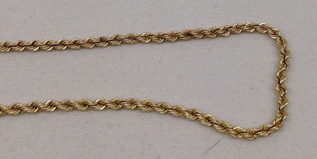 One stamped 14KT yellow gold uni-sex 2.5mm thick, 18" long rope chain with a bright polish finish. Total Weight of Chain 6.30 dwt. One stamped 14KT yellow gold uni-sex 2.5mm thick, 18" long rope chain with a bright polish finish. Total Weight of Chain 6.30 dwt.