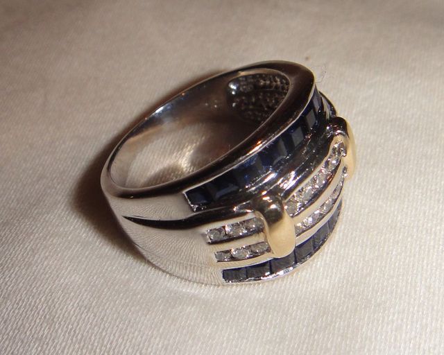 One stamped 10KT white and yellow gold lady's cast diamond and sapphire ring with a bright polish finish. Containing: Twenty-two channel set round brilliant cut diamonds, measuring 1.80-1.60 x 1.02mm (depth est.) approximate total weight of 22 Stones= 0.39ct. Clarity- SI-2 to I-1; Color- T-U; Cut-Fair. Eighteen bezel set square standard step cut synthetic blue sapphires, measuring 2.30 x 1.90 x 1.00mm, approximate total weight of 0.72ct., clarity is eye clean, type II, medium dark, vivid, blue color, (GIA B 6/6), cut is good. Sapphires determined synthetic with magnification. Inclusion pattern indictive of artificial synthesis. Total Weight of Colored Stones 0.72ct. Total Weight of Diamonds 0.39ct. Total Weight of Ring 3.60 dwt. Size 6. One stamped 10KT white and yellow gold lady's cast diamond and sapphire ring with a bright polish finish. Containing: Twenty-two channel set round brilliant cut diamonds, measuring 1.80-1.60 x 1.02mm (depth est.) approximate total weight of 22 Stones= 0.39ct. Clarity- SI-2 to I-1; Color- T-U; Cut-Fair. Eighteen bezel set square standard step cut synthetic blue sapphires, measuring 2.30 x 1.90 x 1.00mm, approximate total weight of 0.72ct., clarity is eye clean, type II, medium dark, vivid, blue color, (GIA B 6/6), cut is good. Sapphires determined synthetic with magnification. Inclusion pattern indictive of artificial synthesis. Total Weight of Colored Stones 0.72ct. Total Weight of Diamonds 0.39ct. Total Weight of Ring 3.60 dwt. Size 6.
