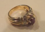One stamped 14KT yellow gold lady's cast ruby and diamond ring with a ribbed shank with a bright polish finish. Containing: One prong set oval standard brilliant cut natural ruby, measuring 6.20 x 5.18 x 3.50mm, 12% bulge factor, approximate weight of 1.02ct., clarity is moderately included, type II, dark, strong, red color, (GIA R 7/5), cut is good. Stone tested as double refractive. Stone tested 1.77 for refractive index. Stone is appraised and valued as heat treated. Twelve channel set baguette cut diamonds, measuring from 2.40 x 1.80 x 1.53mm (depth est.) to 2.50 x 2.10 x 1.79mm (depth est.) approximate total weight of 12 Stones= 0.87ct. Clarity- VS-1 to VS-2; Color- H-J; Cut-Very Good. Total Weight of Colored Stones 1.02ct. Total Weight of Diamonds 0.87ct. Total Weight of Ring 4.50 dwt. Size 5 3/4. One stamped 14KT yellow gold lady's cast ruby and diamond ring with a ribbed shank with a bright polish finish. Containing: One prong set oval standard brilliant cut natural ruby, measuring 6.20 x 5.18 x 3.50mm, 12% bulge factor, approximate weight of 1.02ct., clarity is moderately included, type II, dark, strong, red color, (GIA R 7/5), cut is good. Stone tested as double refractive. Stone tested 1.77 for refractive index. Stone is appraised and valued as heat treated. Twelve channel set baguette cut diamonds, measuring from 2.40 x 1.80 x 1.53mm (depth est.) to 2.50 x 2.10 x 1.79mm (depth est.) approximate total weight of 12 Stones= 0.87ct. Clarity- VS-1 to VS-2; Color- H-J; Cut-Very Good. Total Weight of Colored Stones 1.02ct. Total Weight of Diamonds 0.87ct. Total Weight of Ring 4.50 dwt. Size 5 3/4.