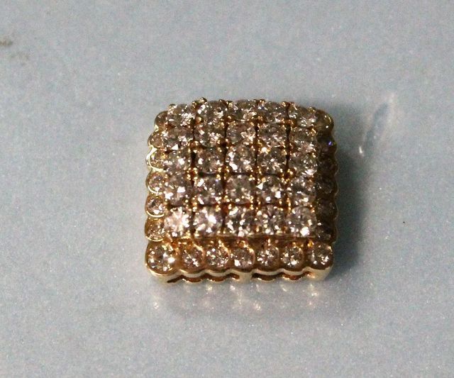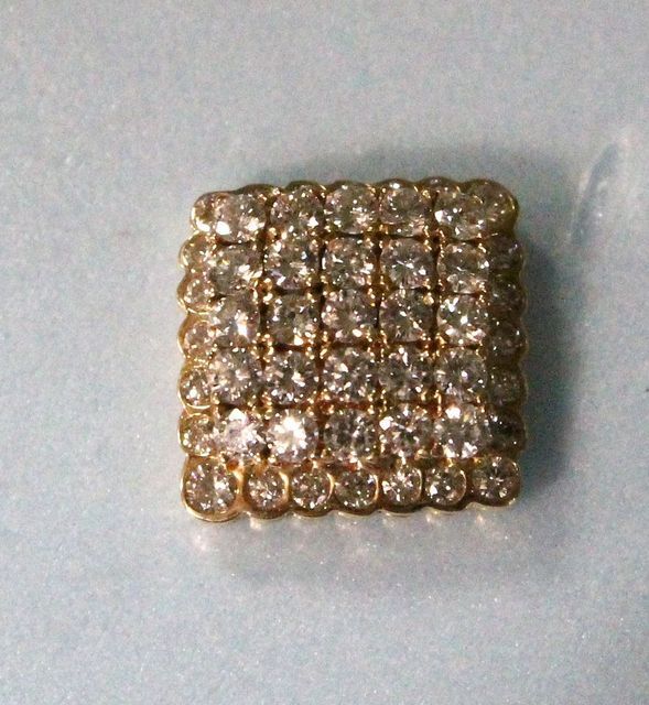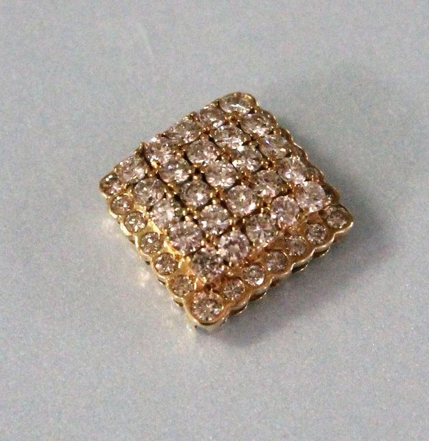 One diamond pendant measuring 16.0mm square and cast of 14K yellow gold with a high polish. Prong set in the center in five rows are 25 round, brilliant cut diamonds measuring 2.2mm each and weighing approximately 1.90 carats total with VS2-SI1 clarity and H/I color. In a border around the prong set diamonds are flush set round brilliant cut diamonds with twenty measuring approximately 1.8mm and four corner diamonds measuring 2.2mm. These border diamonds weigh approximately 0.60 carat total with VS2-SI1 clarity and H/I. One diamond pendant measuring 16.0mm square and cast of 14K yellow gold with a high polish. Prong set in the center in five rows are 25 round, brilliant cut diamonds measuring 2.2mm each and weighing approximately 1.90 carats total with VS2-SI1 clarity and H/I color. In a border around the prong set diamonds are flush set round brilliant cut diamonds with twenty measuring approximately 1.8mm and four corner diamonds measuring 2.2mm. These border diamonds weigh approximately 0.60 carat total with VS2-SI1 clarity and H/I.