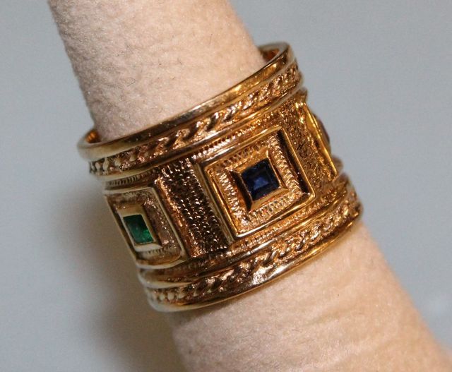 One stamped 14KT yellow gold lady's cast three stone ring with a bright polish with textured accents finish. Containing: One bezel set square standard step cut natural emerald, measuring 4.00 x 3.70 x 1.60mm, approximate weight of 0.16ct., clarity is slightly included, type III, medium dark, strong, green color, (GIA G 6/5), cut is very good. Emerald has been enhanced with fracture-filling. Fracture filling is a common practice for treatment of emeralds and is considered stable. One bezel set square standard step cut synthetic ruby, measuring 3.80 x 3.50 x 1.40mm, approximate weight of 0.19ct., clarity is eye clean, type II, medium light, moderately strong, red color, (GIA R 4/4), cut is good. Stone determined synthetic by magnification. Inclusion pattern indictive of artificial synthesis. One bezel set square standard step cut synthetic blue sapphire, measuring 4.10 x 3.50 x 1.40mm, approximate weight of 0.20ct., clarity is eye clean, type II, medium dark, vivid, blue color, (GIA B 6/6), cut is good. Stone determined synthetic by magnification. Inclusion pattern indictive of artificial synthesis. Total Weight of Colored Stones 0.55ct. Total Weight of Ring 4.80 dwt. Size 5 1/2. One stamped 14KT yellow gold lady's cast three stone ring with a bright polish with textured accents finish. Containing: One bezel set square standard step cut natural emerald, measuring 4.00 x 3.70 x 1.60mm, approximate weight of 0.16ct., clarity is slightly included, type III, medium dark, strong, green color, (GIA G 6/5), cut is very good. Emerald has been enhanced with fracture-filling. Fracture filling is a common practice for treatment of emeralds and is considered stable. One bezel set square standard step cut synthetic ruby, measuring 3.80 x 3.50 x 1.40mm, approximate weight of 0.19ct., clarity is eye clean, type II, medium light, moderately strong, red color, (GIA R 4/4), cut is good. Stone determined synthetic by magnification. Inclusion pattern indictive of artificial synthesis. One bezel set square standard step cut synthetic blue sapphire, measuring 4.10 x 3.50 x 1.40mm, approximate weight of 0.20ct., clarity is eye clean, type II, medium dark, vivid, blue color, (GIA B 6/6), cut is good. Stone determined synthetic by magnification. Inclusion pattern indictive of artificial synthesis. Total Weight of Colored Stones 0.55ct. Total Weight of Ring 4.80 dwt. Size 5 1/2.