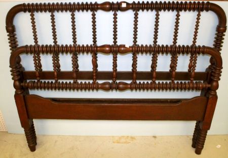 Early 20th century, walnut, spool bed; with rails, double size; 49" h. Early 20th century, walnut, spool bed; with rails, double size; 49" h.