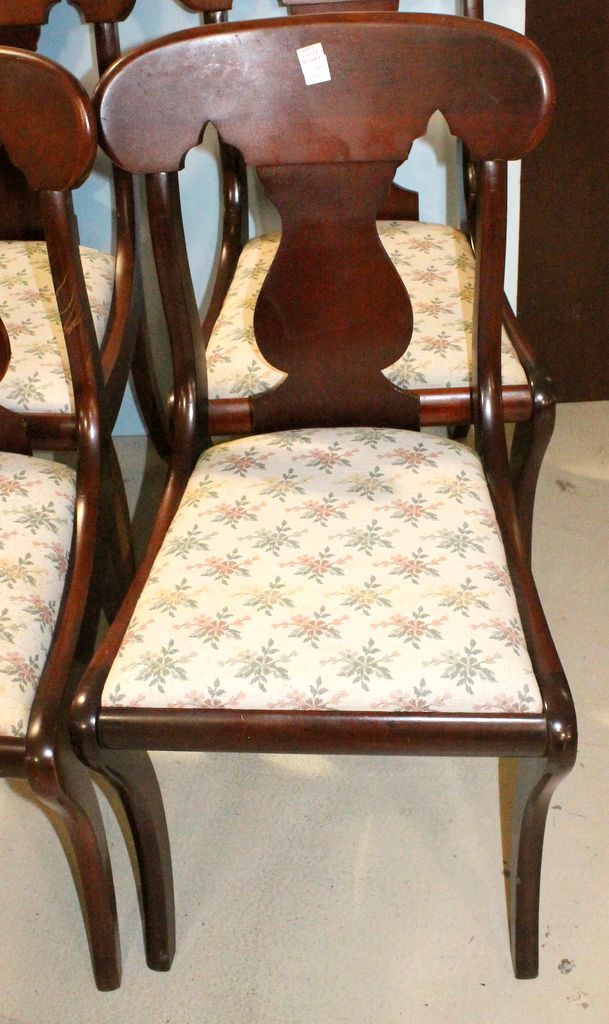 Late 19th century set of mahogany empire dining chairs with gothic style splats. Two arms, six sides; 17 1/2" w., 16 1/2" d., 34 1/2" h. Late 19th century set of mahogany empire dining chairs with gothic style splats. Two arms, six sides; 17 1/2" w., 16 1/2" d., 34 1/2" h.