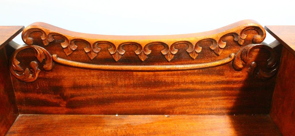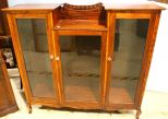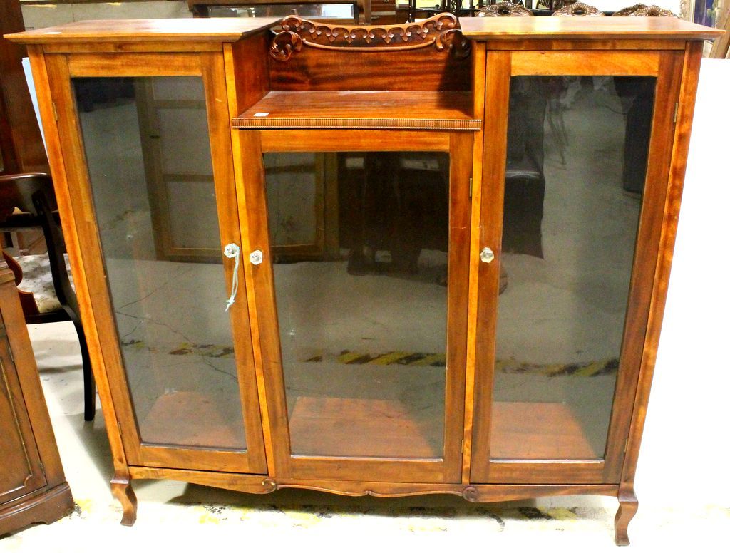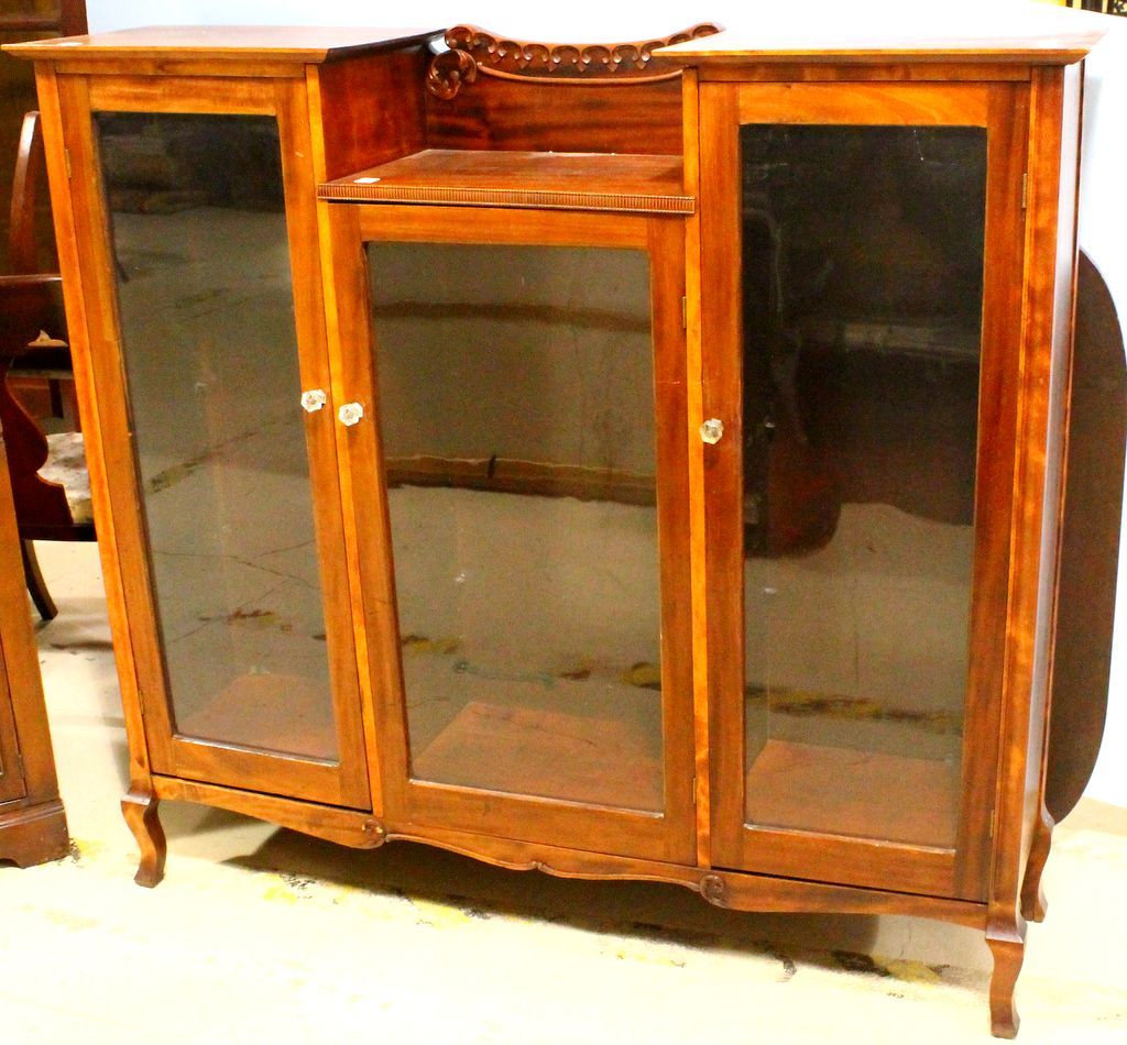 Early 20th century mahogany bookcase. Three glass doors with three interior shelves, carved center step down backsplash; 57" w., 14" d., 52" h. Early 20th century mahogany bookcase. Three glass doors with three interior shelves, carved center step down backsplash; 57" w., 14" d., 52" h.
