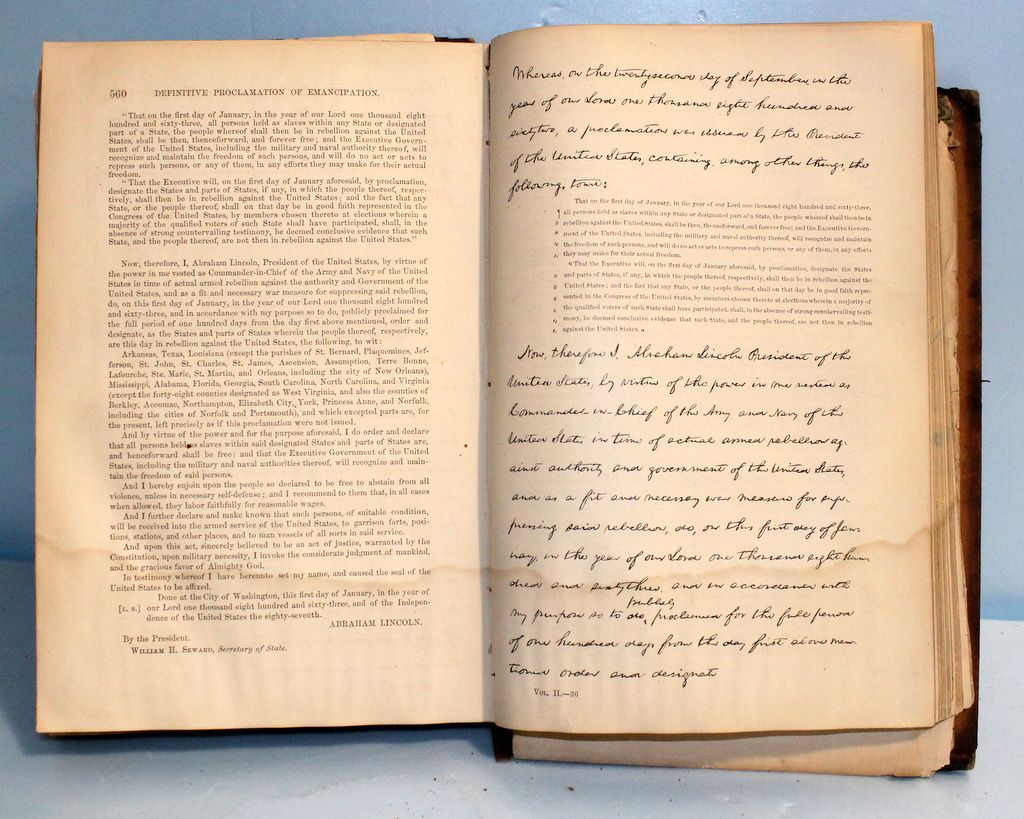 Two 1866 volumes (I and II) of the history of the Civil War by Benson J. Lossing, published by George W. Childs, Philadelphia. These books although interesting are not in good condition. They have been in an attic, missing one cover, covers not connected to pages, overall worn but appear to have all of the pages. Has copy of President Lincolns Proclamation of Emancipation in his hand writing. Has section on Vicksburg, Mississippi. Two 1866 volumes (I and II) of the history of the Civil War by Benson J. Lossing, published by George W. Childs, Philadelphia. These books although interesting are not in good condition. They have been in an attic, missing one cover, covers not connected to pages, overall worn but appear to have all of the pages. Has copy of President Lincolns Proclamation of Emancipation in his hand writing. Has section on Vicksburg, Mississippi.