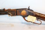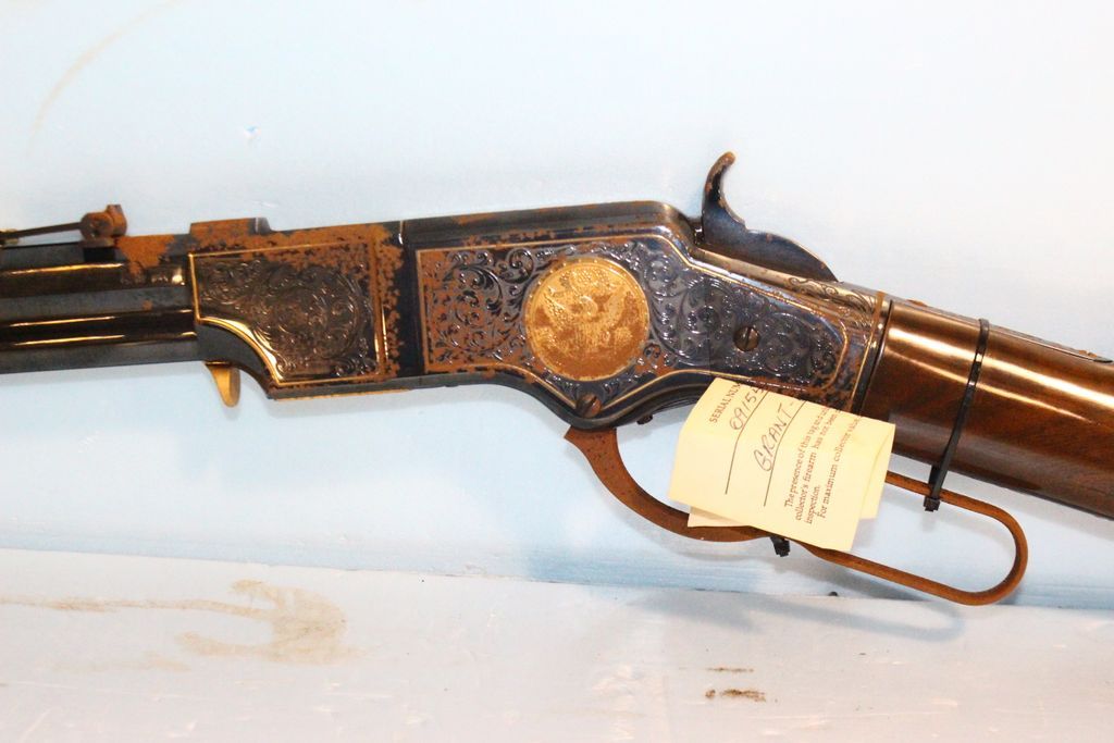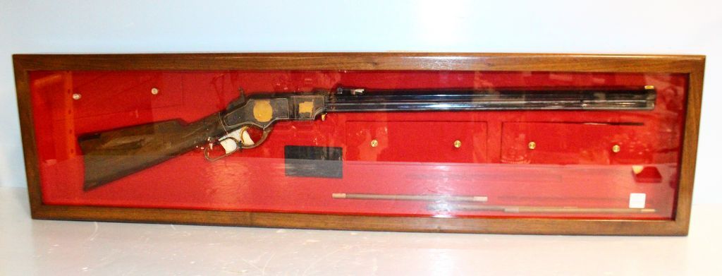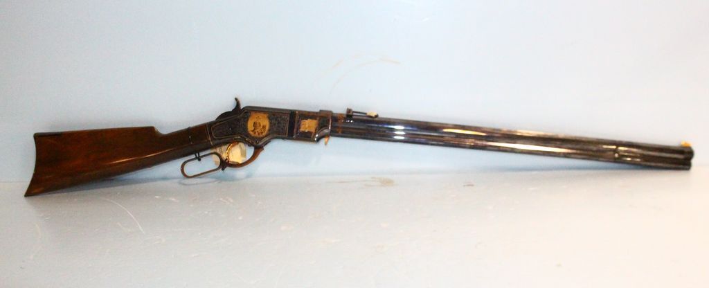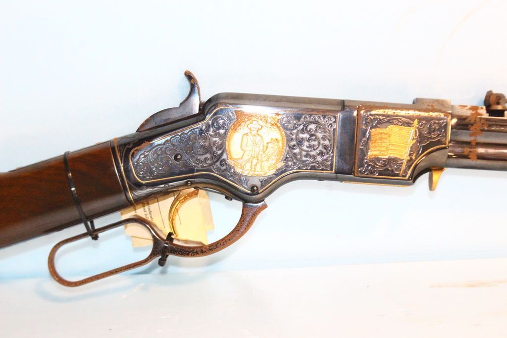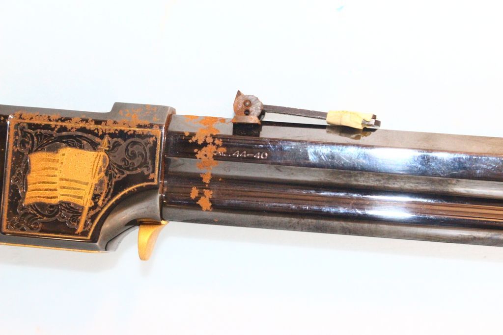 1 of 250, Iron Frame, Cal. 44-40, hand engraved, display box, with cleaning rod, new in box, blue with 24 karat gold plating, has rust spots. Serial:13-09155 1 of 250, Iron Frame, Cal. 44-40, hand engraved, display box, with cleaning rod, new in box, blue with 24 karat gold plating, has rust spots. Serial:13-09155