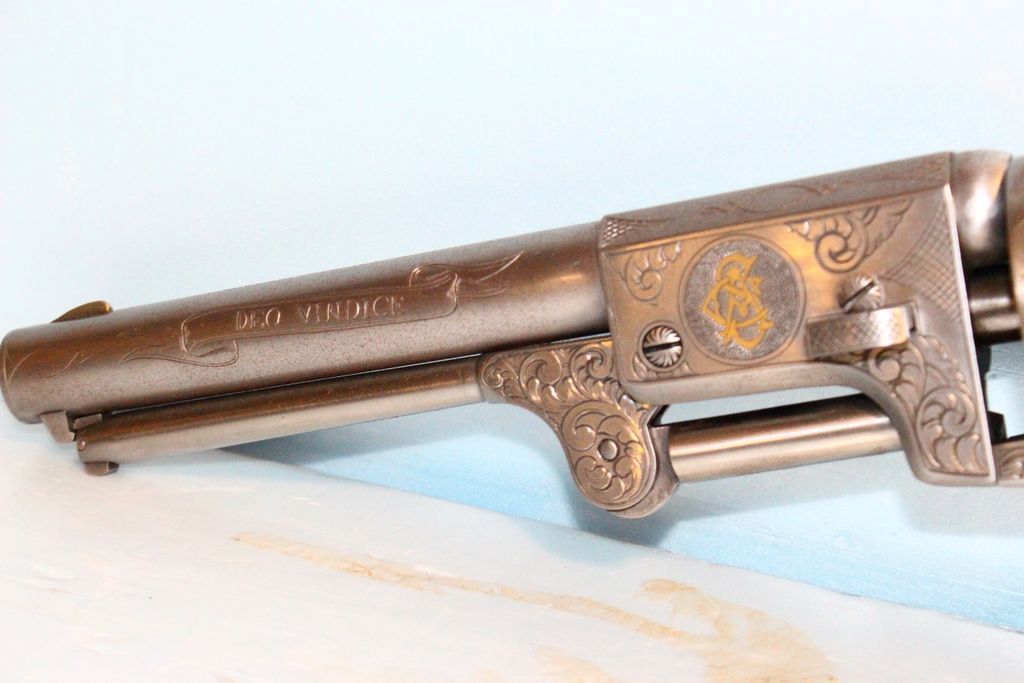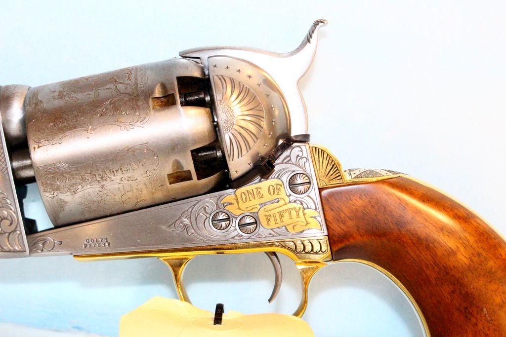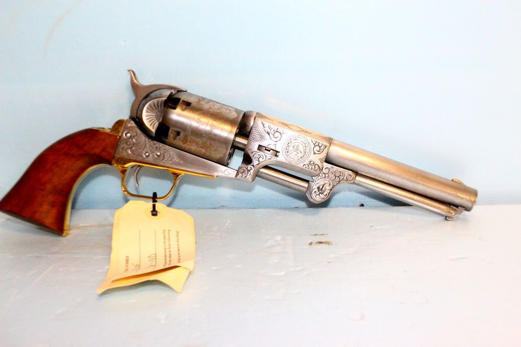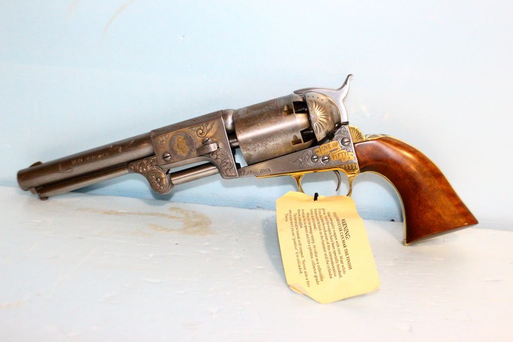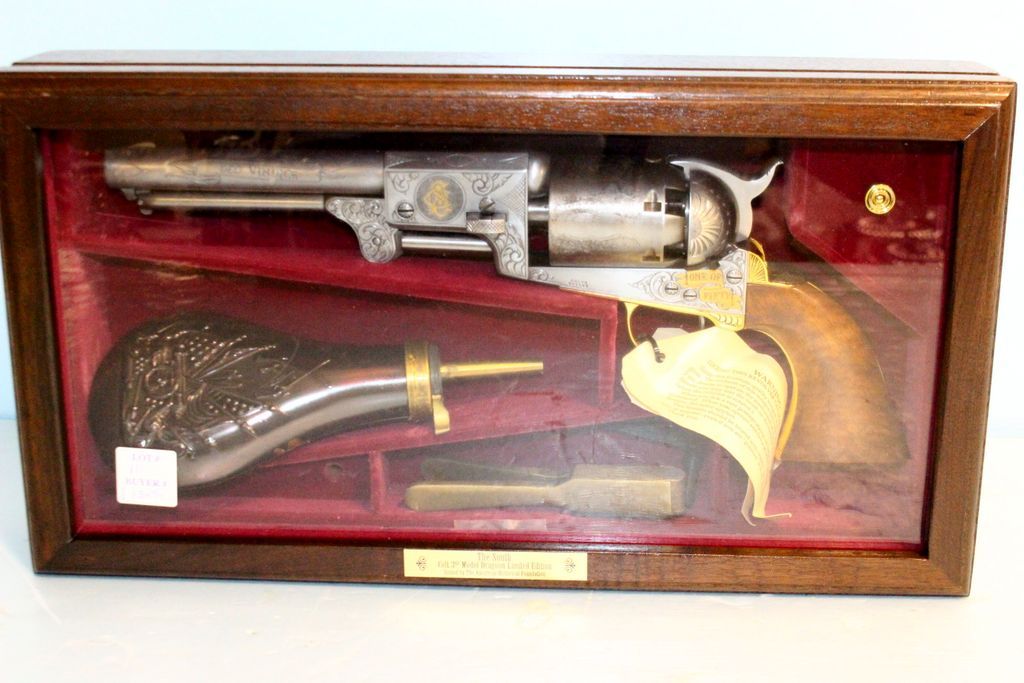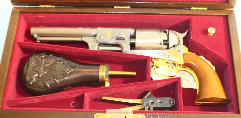 1 0f 50 Deluxe, Cal. 44, black powder, display case with bullet mold and flask, new in box, hand engraved, grayed steel. Serial: CSA-13 D 1 0f 50 Deluxe, Cal. 44, black powder, display case with bullet mold and flask, new in box, hand engraved, grayed steel. Serial: CSA-13 D