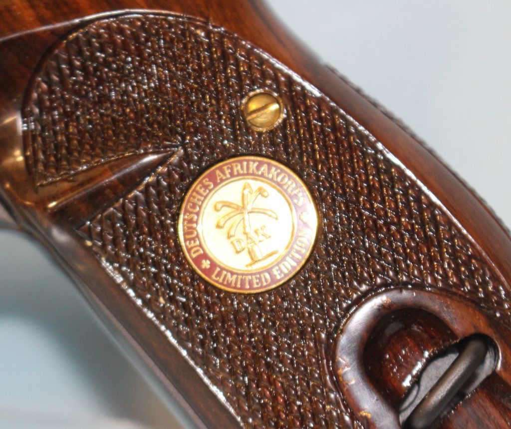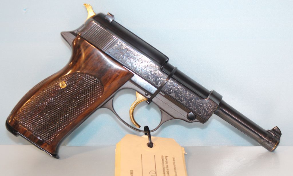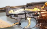 1 0f 100, Deluxe edition, Cal. 9mm Parabellum, blue finish, display case, 24 karat gold plating, new in box, hand engraved. Serial: 7213B 1 0f 100, Deluxe edition, Cal. 9mm Parabellum, blue finish, display case, 24 karat gold plating, new in box, hand engraved. Serial: 7213B