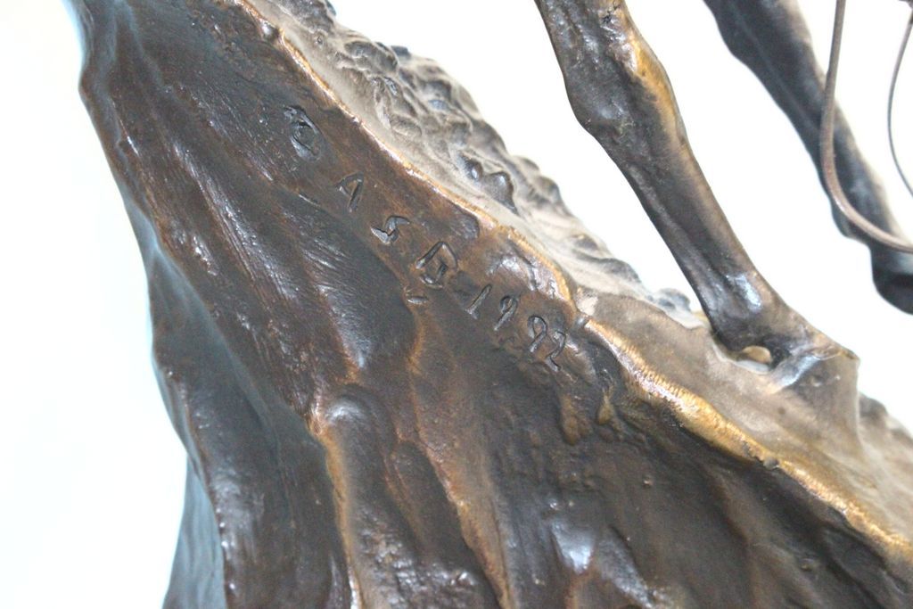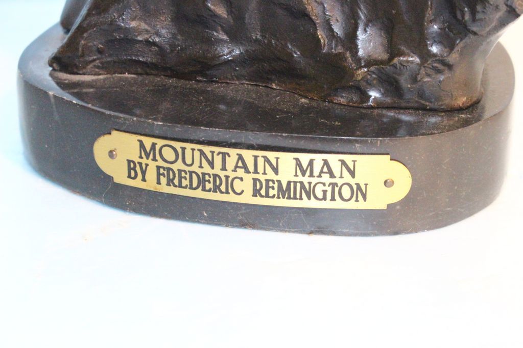 "Mountain Man" bronze on marble base by Fredrick Remington. Statue is of indian riding a horse down mountain. Marked on bottom ASR 1992, signed Remington; 14 1/2" h. "Mountain Man" bronze on marble base by Fredrick Remington. Statue is of indian riding a horse down mountain. Marked on bottom ASR 1992, signed Remington; 14 1/2" h.
