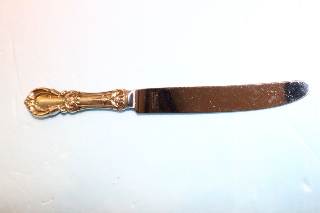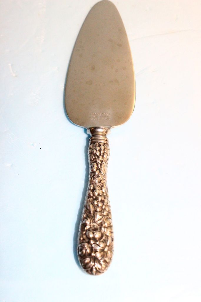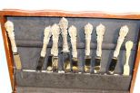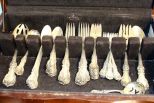 Eight dinner knives, one butter knife, eight dinner forks, eight salad forks, eight cocktail forks, eight teaspoons, two pc. Salad set, one serving spoon, two pc. Carving fork, ladle, berry spoon, two serving spoons (tomato), sterling Steiff pie server (stainless handle); 57 total pieces; display box not included Eight dinner knives, one butter knife, eight dinner forks, eight salad forks, eight cocktail forks, eight teaspoons, two pc. Salad set, one serving spoon, two pc. Carving fork, ladle, berry spoon, two serving spoons (tomato), sterling Steiff pie server (stainless handle); 57 total pieces; display box not included