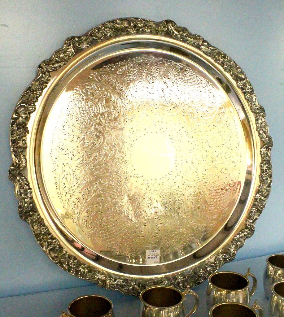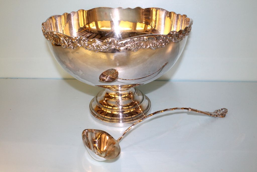 Beautiful vintage F.B. Rogers punch set consisting of tray, eleven cups, large ladle, and punch bowl ; tray, 19" dia. ; punch bowl, 14 1/2" dia. ; 14 pieces total Beautiful vintage F.B. Rogers punch set consisting of tray, eleven cups, large ladle, and punch bowl ; tray, 19" dia. ; punch bowl, 14 1/2" dia. ; 14 pieces total
