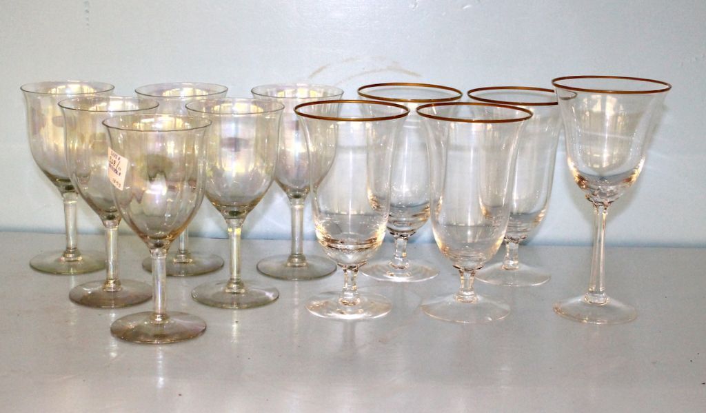 Set of six clear iridescent glasses, 6 1/2" h. and five glasses with gold rim, four 7" h., one 8" h. ; eleven total Set of six clear iridescent glasses, 6 1/2" h. and five glasses with gold rim, four 7" h., one 8" h. ; eleven total