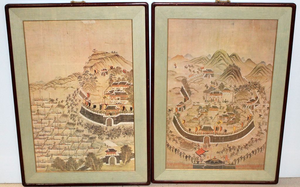 Pair early 20th century handpainted on paper Chinese landscape and warrior scene with fabric matte and gold liner; 23" w., 32 1/2" h. Pair early 20th century handpainted on paper Chinese landscape and warrior scene with fabric matte and gold liner; 23" w., 32 1/2" h.