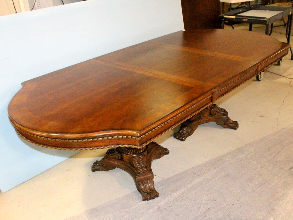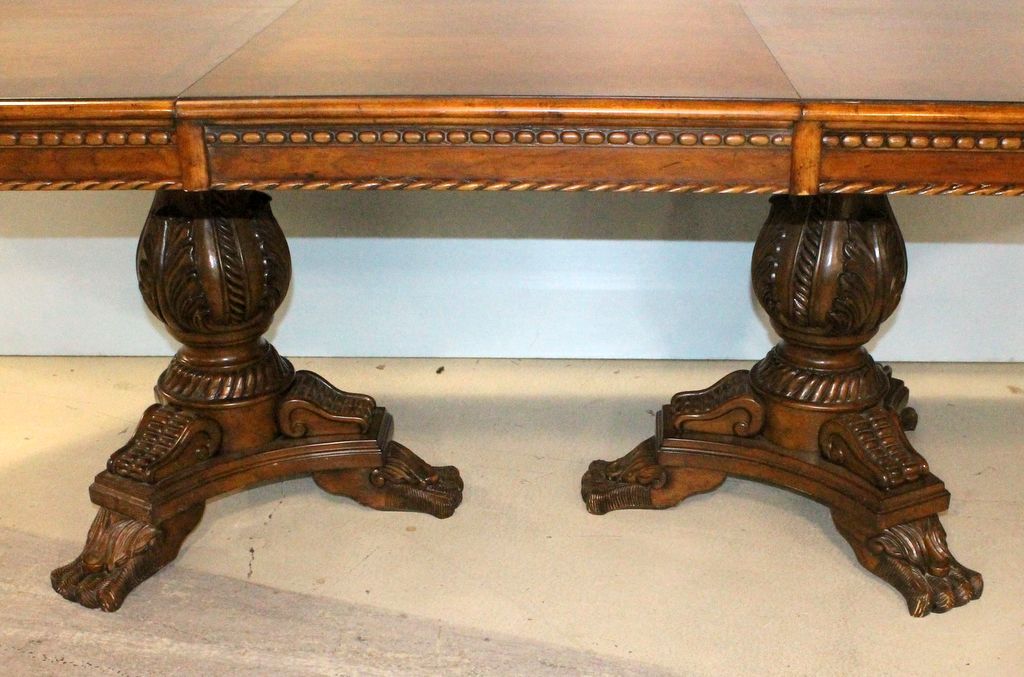 Crossbanded dining table with unusual shaped top, two heavily carved pedestals that accommodate a wide, skirted leaf; table, 73" w., 45" d., 31" h. ; leaf, 24" w. Crossbanded dining table with unusual shaped top, two heavily carved pedestals that accommodate a wide, skirted leaf; table, 73" w., 45" d., 31" h. ; leaf, 24" w.