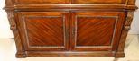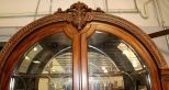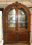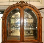 Large two door China cabinet with beveled glass doors, cut with arch shaped design , glass interior shelves, two carved bottom doors. Top section is in shape of dome and lighted; 64 1/2" w., 19" d., 97" h. Large two door China cabinet with beveled glass doors, cut with arch shaped design , glass interior shelves, two carved bottom doors. Top section is in shape of dome and lighted; 64 1/2" w., 19" d., 97" h.