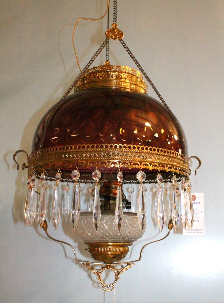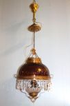 Victorian brass hanging fixture with cranberry shade; 48" h., 15" w. Victorian brass hanging fixture with cranberry shade; 48" h., 15" w.