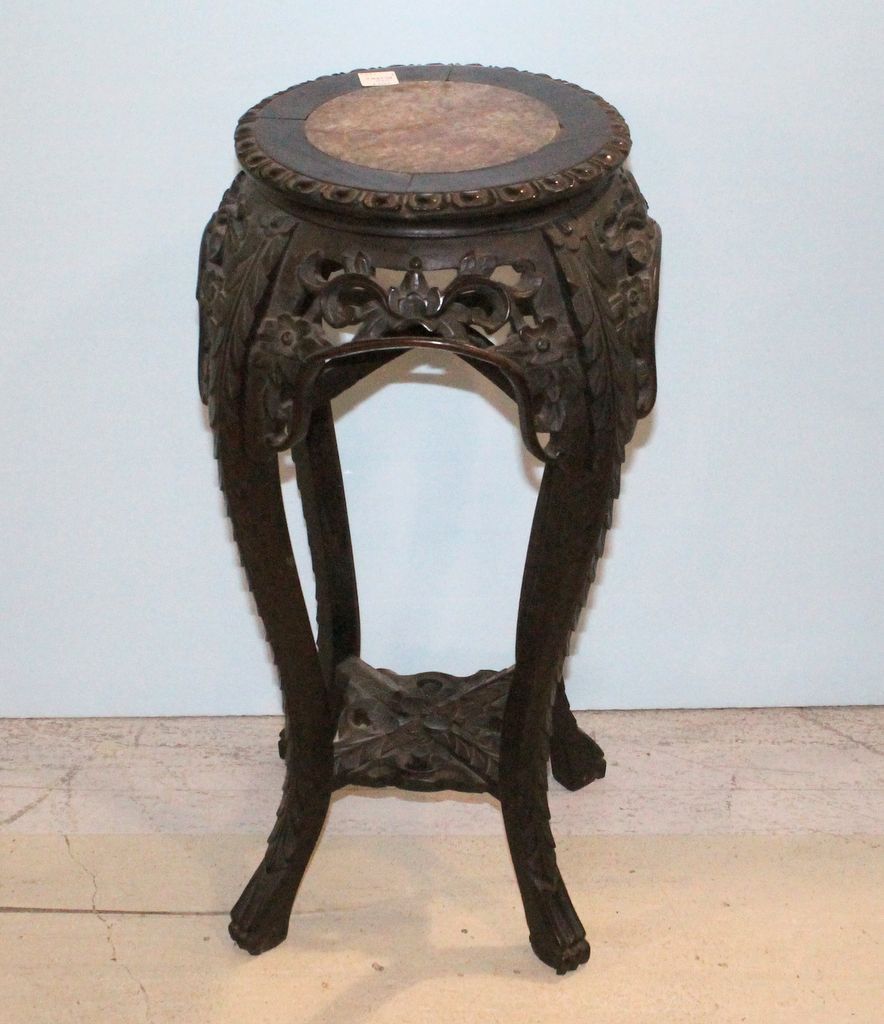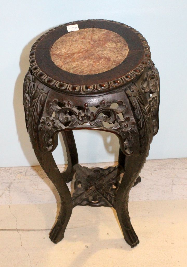 Antique oriental style carved rosewood stand with marble top; 12" dia., 24" h. Antique oriental style carved rosewood stand with marble top; 12" dia., 24" h.