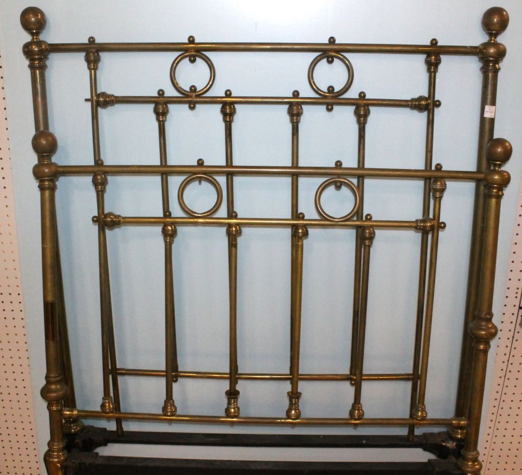 Twin size brass bed with iron rails, porcelain rollers; 59" h. Twin size brass bed with iron rails, porcelain rollers; 59" h.