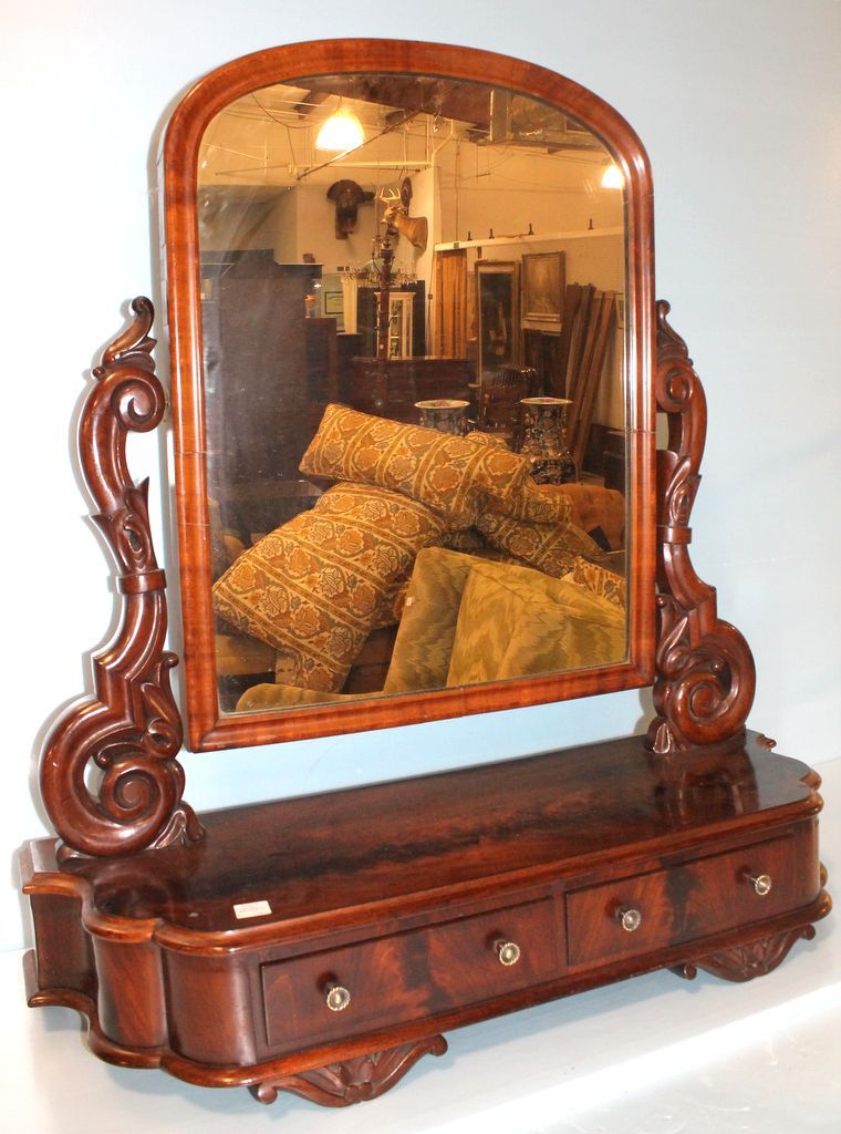 Large 19th century mahogany Victorian shaving mirror with two drawers; 31 1/2" w., 13" d., 24" h. Large 19th century mahogany Victorian shaving mirror with two drawers; 31 1/2" w., 13" d., 24" h.