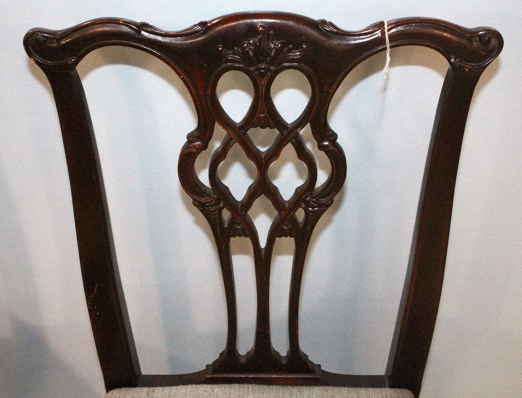 Pair chippendale style mahogany side chairs from turn of the century; 18" w., 18" d., 36 1/2" h. Pair chippendale style mahogany side chairs from turn of the century; 18" w., 18" d., 36 1/2" h.