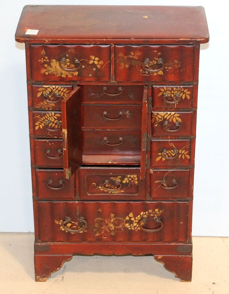 Small red lacquer meji period Japanese Tansu chest; 16" w., 8" d., 16" h. Small red lacquer meji period Japanese Tansu chest; 16" w., 8" d., 16" h.