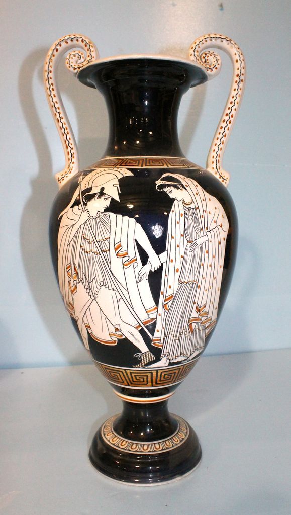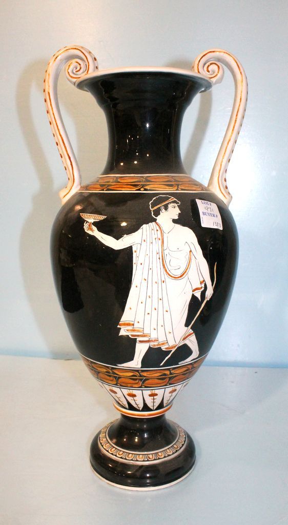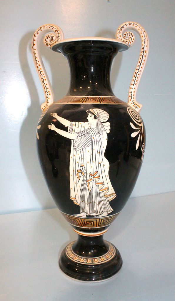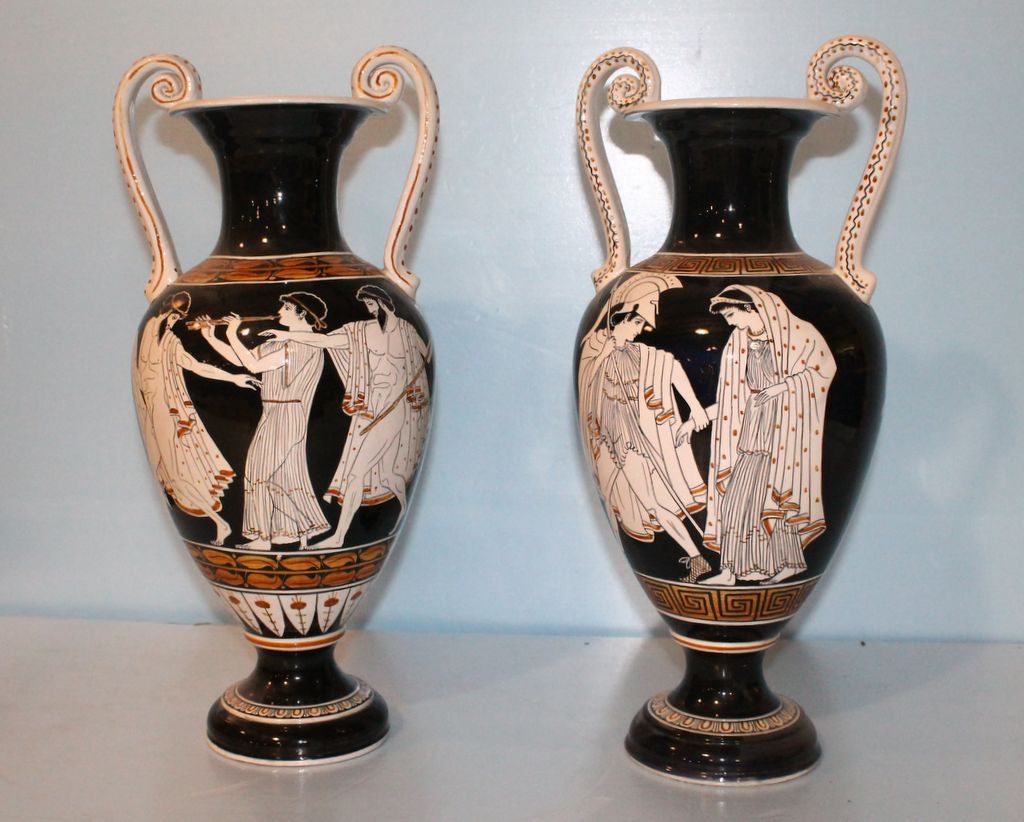 Pair porcelain classical style urns marked Keramen; 16 1/2" h. Pair porcelain classical style urns marked Keramen; 16 1/2" h.