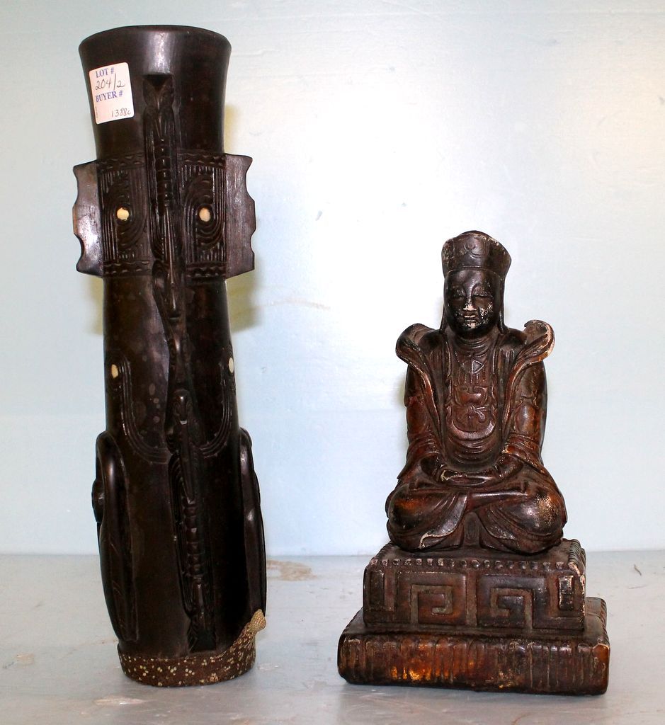 Hand carved wood Buddha, 5" w., 9" h. ; hand carved wood Tiki figurine with mother of pearl accents, 12 1/2" h. Hand carved wood Buddha, 5" w., 9" h. ; hand carved wood Tiki figurine with mother of pearl accents, 12 1/2" h.