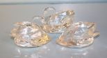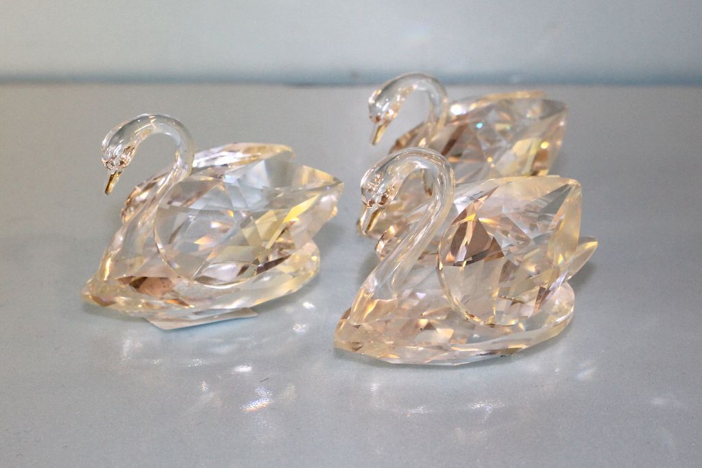 Three signed Swarovski crystal swans, 3" w., 2" h. ; two signed baccarat hearts, 2 7/8" w. Three signed Swarovski crystal swans, 3" w., 2" h. ; two signed baccarat hearts, 2 7/8" w.