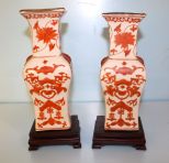 Pair porcelain Chinese vases on wood bases. Each vase has cream background with orange Chinese designs; 3 7/8" w., 10" h. Pair porcelain Chinese vases on wood bases. Each vase has cream background with orange Chinese designs; 3 7/8" w., 10" h.