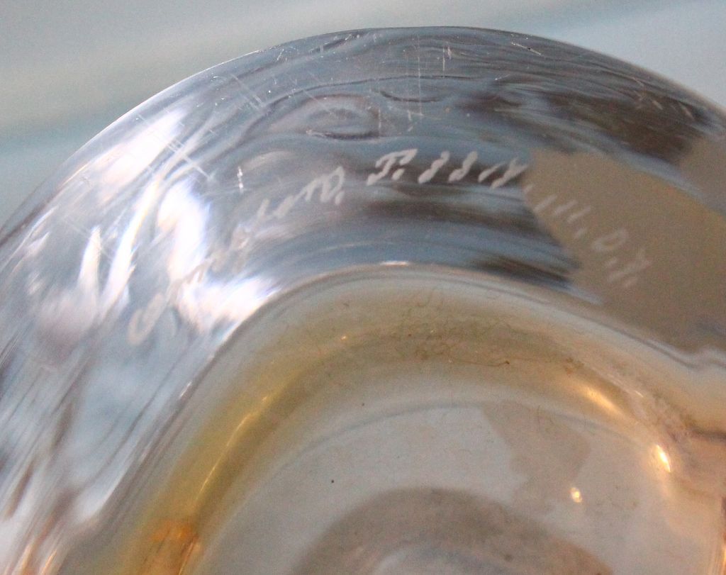 Signed Swedish Orrefors glass vase with etching of young girl with flowers. Vase is signed on base; 3 1/2" sq., 6" h. Signed Swedish Orrefors glass vase with etching of young girl with flowers. Vase is signed on base; 3 1/2" sq., 6" h.