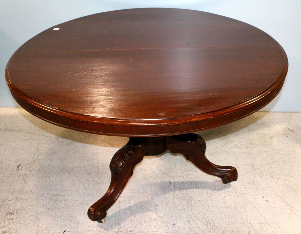 19th century round mahogany table with carved Victorian legs (no leaves) ; 46" dia., 28" h. 19th century round mahogany table with carved Victorian legs (no leaves) ; 46" dia., 28" h.