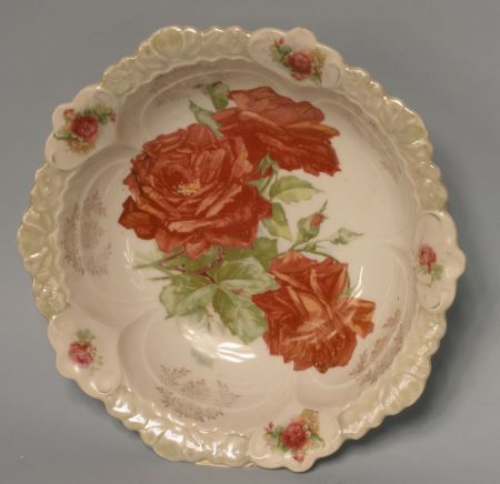 Hand Painted Bowl of Red Roses, first quarter 20th Century. dia. 10-5/8", h. 2-3/4" Hand Painted Bowl of Red Roses, first quarter 20th Century. dia. 10-5/8", h. 2-3/4"