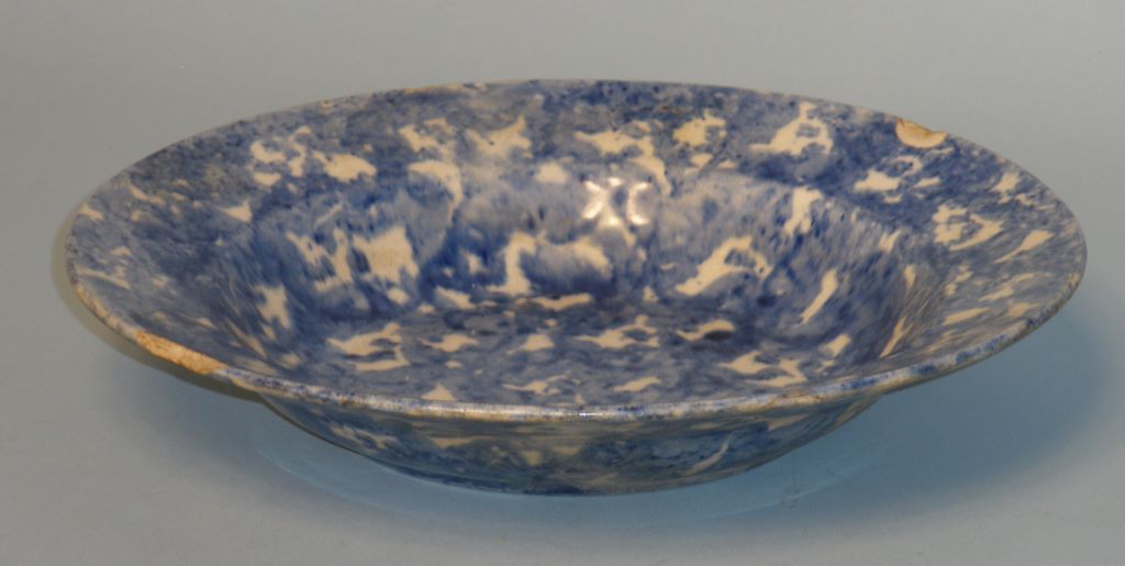American Blue and White Sponge-Bordered and Banded Pottery Kitchen Bowl, last quarter 19th Century. Spongeware designs were applied to the ceramics by daubing the color on with a sponge or cloth. dia. 8-3/4", h. 1-1/2" American Blue and White Sponge-Bordered and Banded Pottery Kitchen Bowl, last quarter 19th Century. Spongeware designs were applied to the ceramics by daubing the color on with a sponge or cloth. dia. 8-3/4", h. 1-1/2"