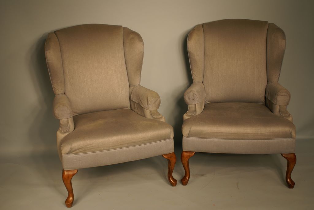 Pair Queen Anne Chairs, upholstered with arm protectors, second quarter 20th Century. w. 28", d. 24-1/2", h. 39" Pair Queen Anne Chairs, upholstered with arm protectors, second quarter 20th Century. w. 28", d. 24-1/2", h. 39"