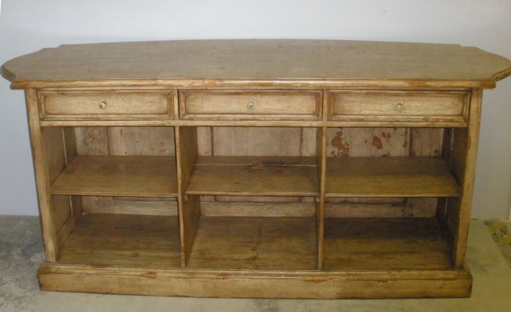 Very unique, antiqued faux finish kitchen island or bar. Paneled front and open shelving back. Beautiful piece of workmanship. W. 80", d. 29", h. 36" Very unique, antiqued faux finish kitchen island or bar. Paneled front and open shelving back. Beautiful piece of workmanship. W. 80", d. 29", h. 36"
