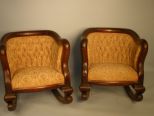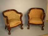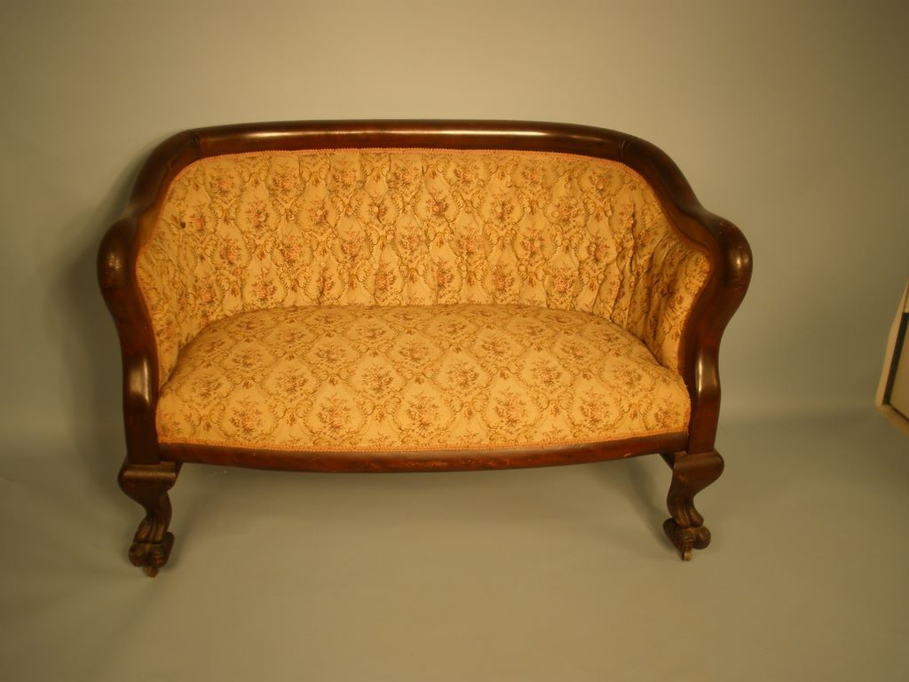 Early Parlor set with Settee, two rockers and two side chairs in what appears to be original fabric, with claw feet, in mahogany wood. chairs- w. 27", h. 32"; couch- w. 49", h. 33-1/2" Early Parlor set with Settee, two rockers and two side chairs in what appears to be original fabric, with claw feet, in mahogany wood. chairs- w. 27", h. 32"; couch- w. 49", h. 33-1/2"